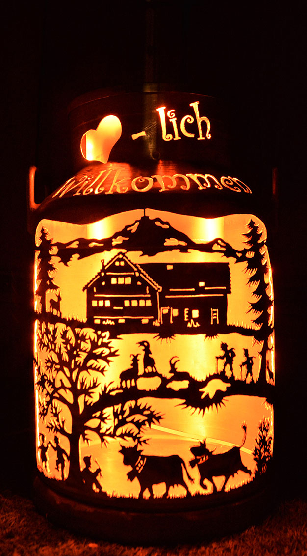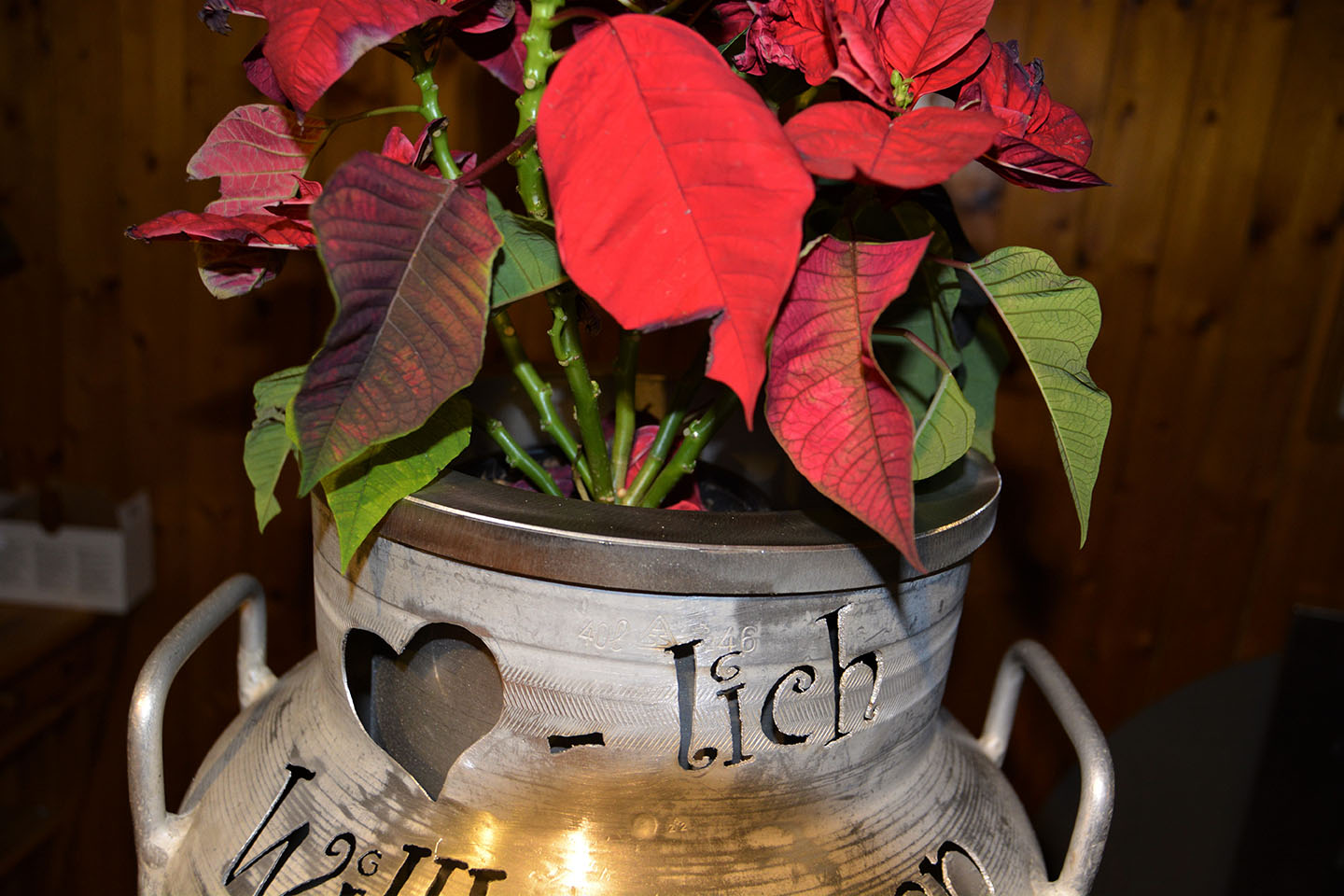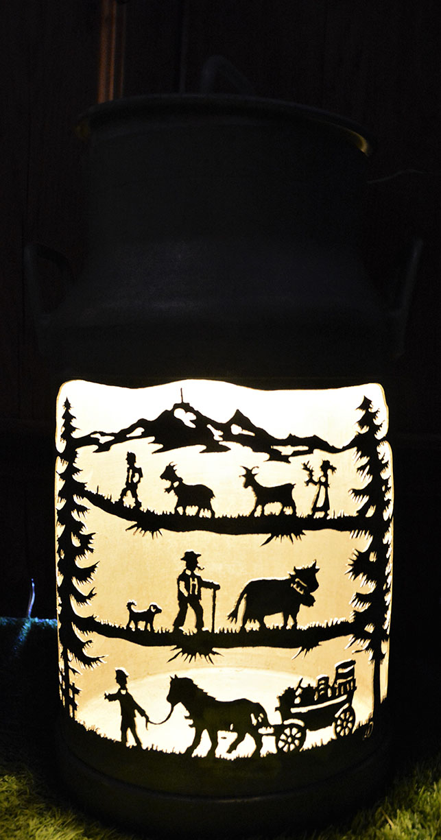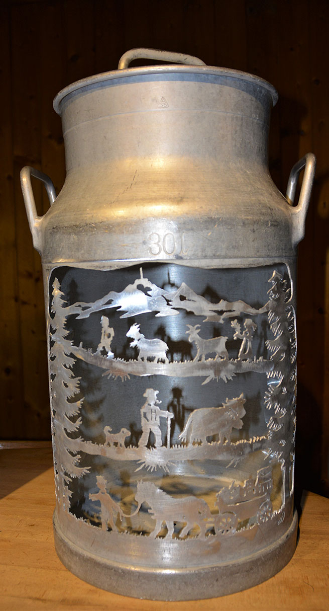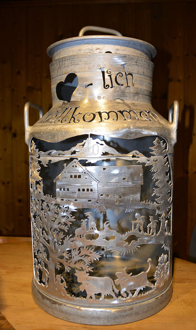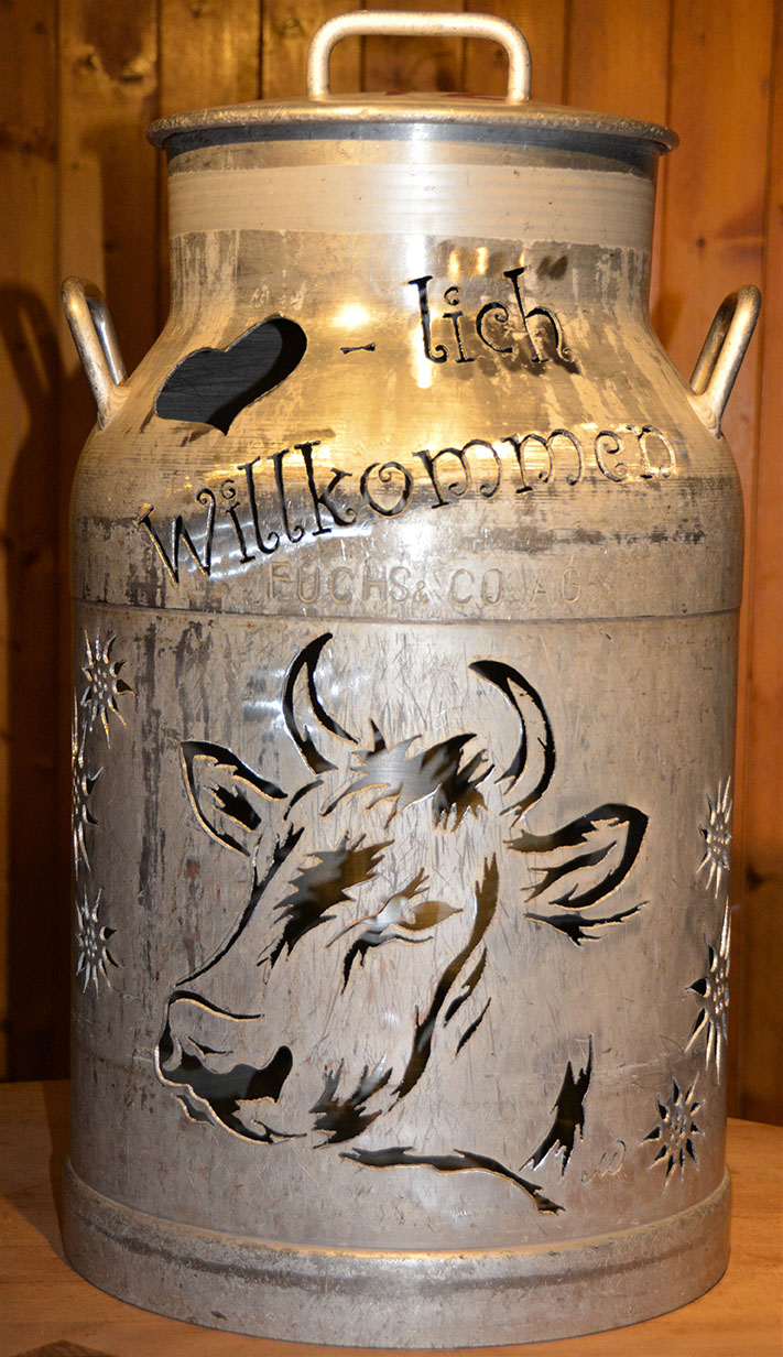 Milchkanne mit Alpleben und Herzlich Willkommen