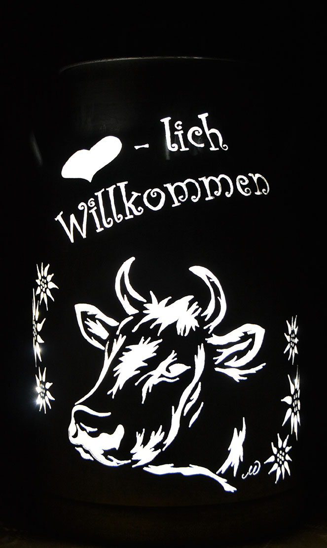 Milchkanne mit Kuhkopf und Herzlich Willkommen