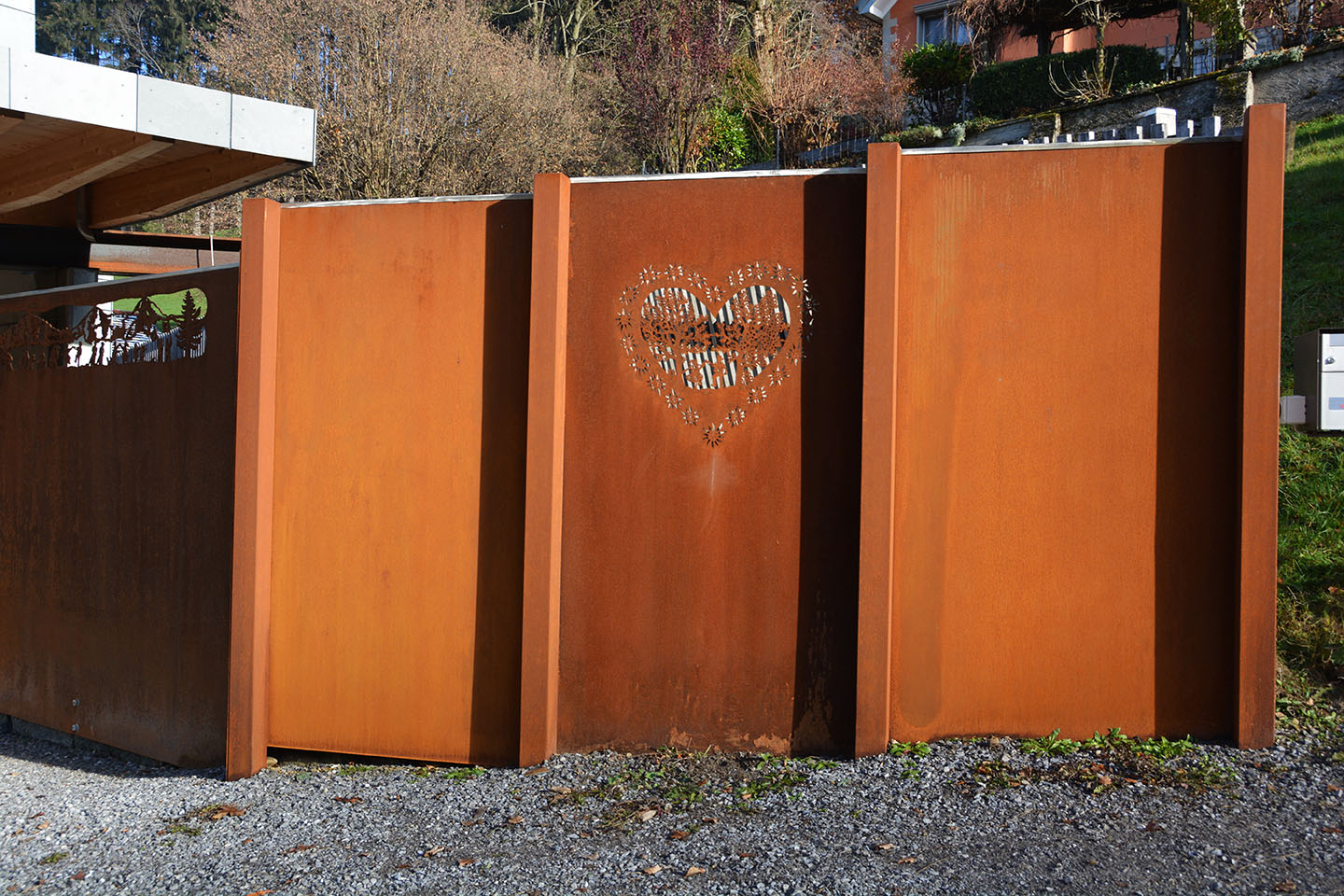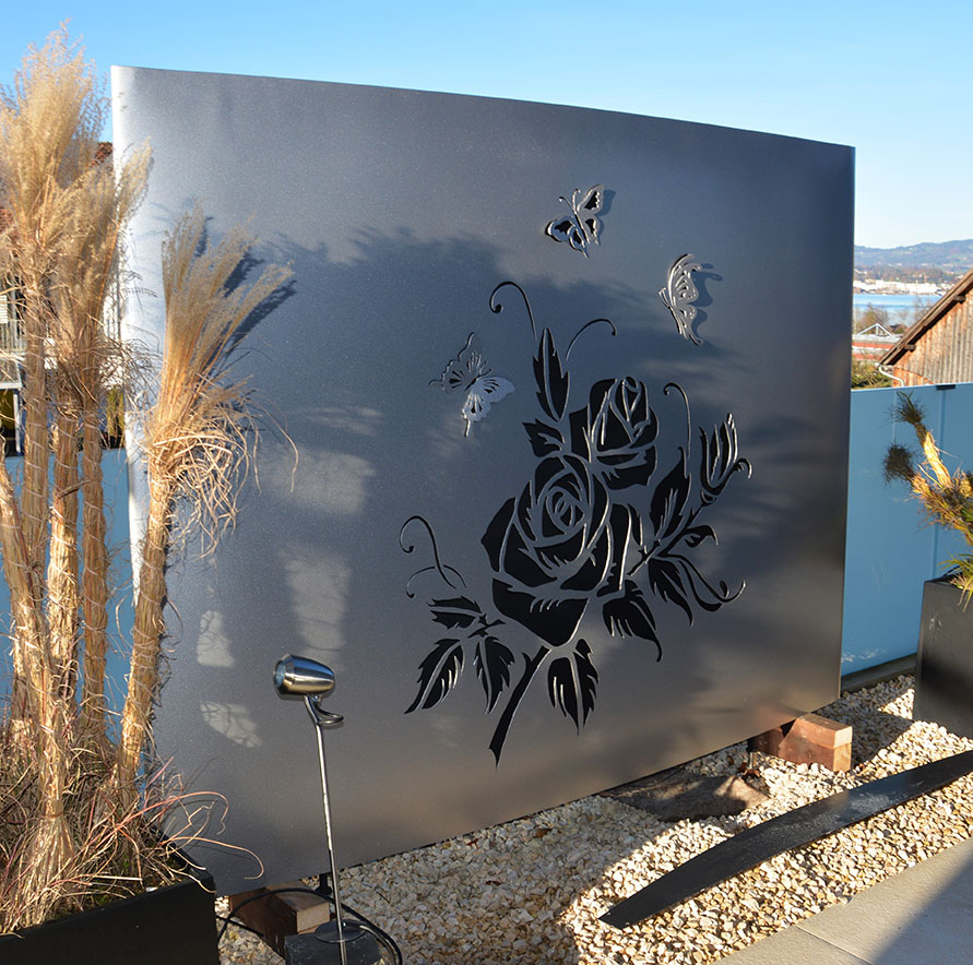 Sichtschutzwand aus 12mm Stahl mit Sitzbänken aus Edelstahl. Sujet: Schwalbenschwarm